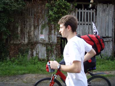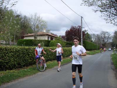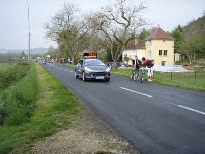 | Après une petite heure d'attente au neuvième km, les accompagnateurs à vélo voient la voiture chrono arriver, suivie du premier coureur. | ![]() |