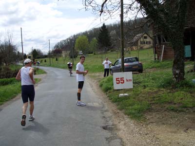 | L'arrivée au 50 ème km, qui respecte l'objectif initial : 50km en 5h. Mais on sait maintenant qu'il ne sera pas possible de tenir jusqu'au 100 ème km à ce rythme. A quelle heure va-t-on finir ? | |