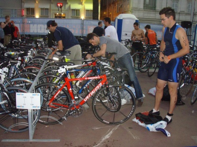 | Je passe à la vérification du vélo par les arbitres, il est conforme, cool ;-) et je le laisse dans le parc à vélo sur la Promenade des Anglais. Je dépose les sacs de transition, demain avant le départ, il ne restera plus qu'à gonfler les pneus à bloc et à remplir les bidons de boisson énergétique, et tout sera prêt... | ![]() |